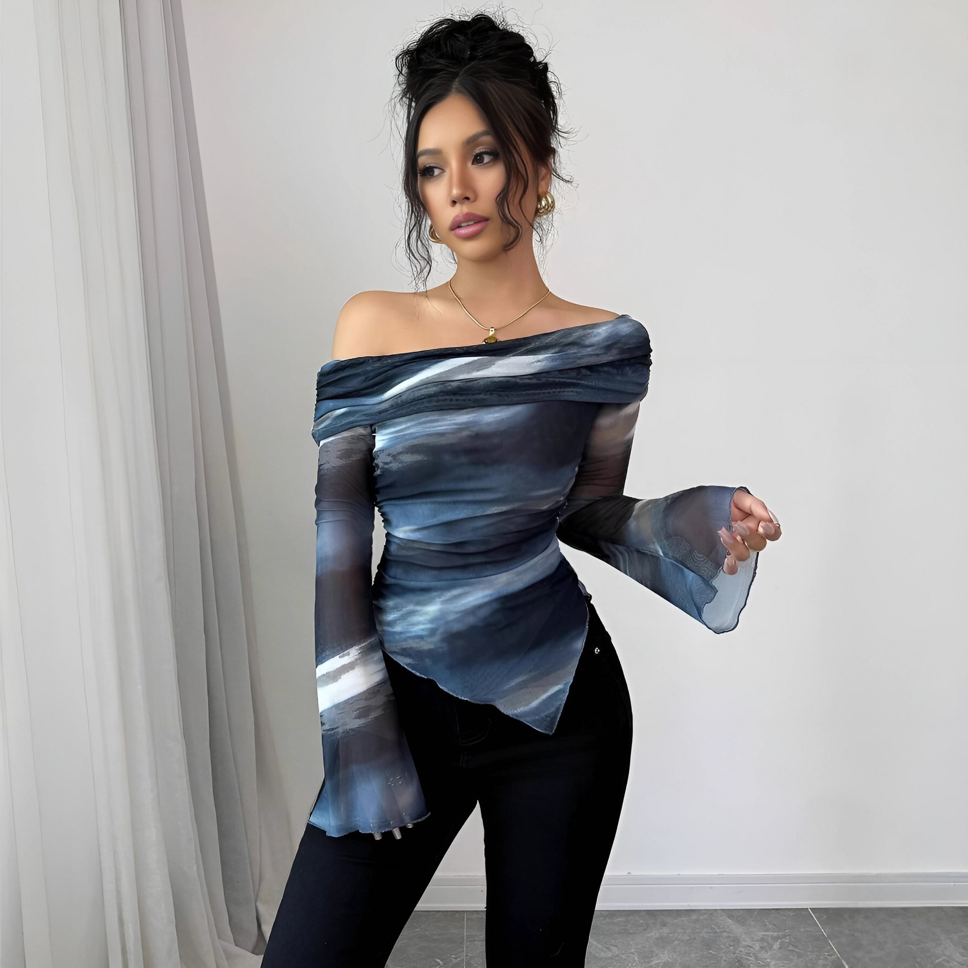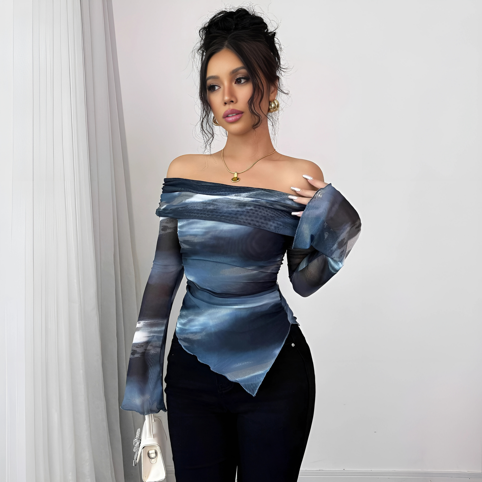 Bring runway drama to everyday styling with the Kyoto Off‑Shoulder Mesh Top. A cloud‑like blue print drapes across a shoulder‑skimming neckline, while sheer long sleeves and a hand‑kerchief hem add movement and intrigue. Pair Kyoto with sleek denim for date night or tuck it into tailored trousers for gallery openings—either way, every gaze will follow you.